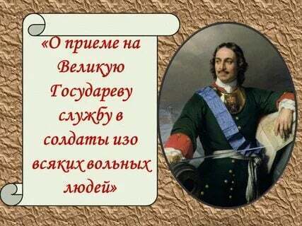 21 ноября 1699 года государь Петр I, готовясь к войне с Швецией, издал указ «О приеме на Великую Государеву службу в солдаты изо всяких вольных ...