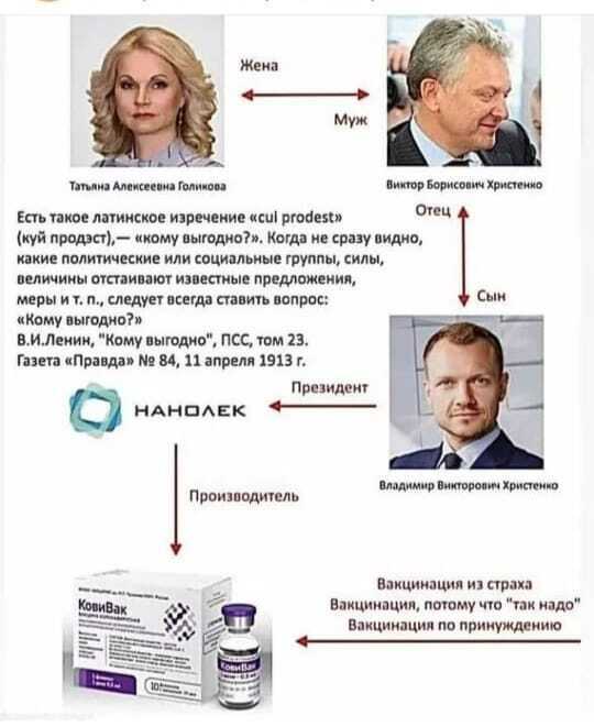 А вы не в курсе, кто за этим стоит: голикова и ее сын с христенко, харитоненков, чубайс... можно продолжить. Сколько заказов на вакцину, чем больше привьют тем больше им денежек в карман упадет. Государство за прививки платит.