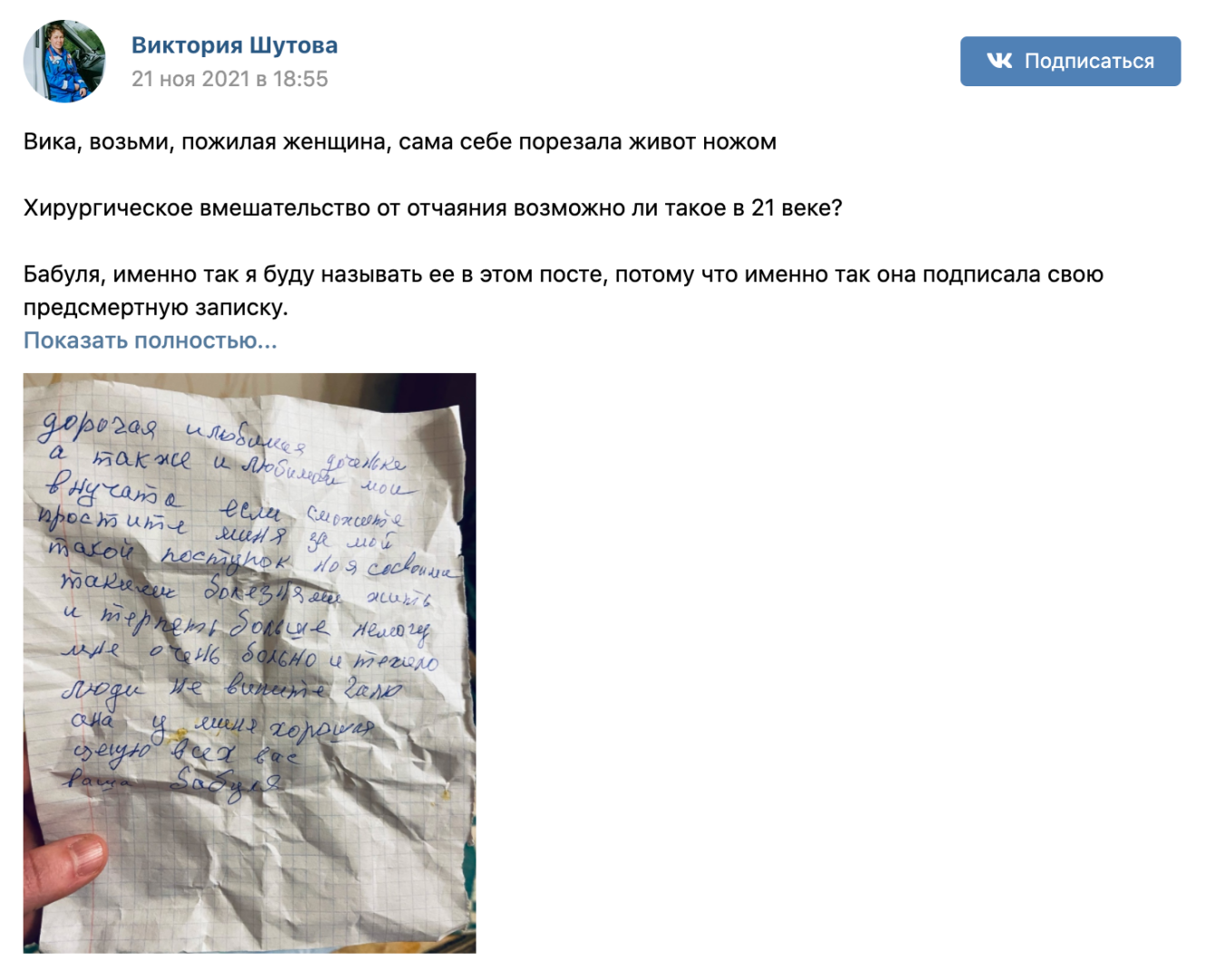 Перед операцией пенсионерка оставила предсмертную записку, так как не была уверена, что переживет неквалифицированное вмешательство.