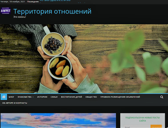 Постараюсь объяснить последовательно. Созданный мной сайт "Территория отношений" по просьбе городских жителей не является полноценным сайтом знакомств. Он лишь содержит рубрику частных объявлений, а весь остальной контент сайта сейчас и далее будет про отношения людей, воспитание детей, семейные проблемы и будут публиковаться истории, случаи, жизненные ситуации как от автора сайта, так и от читателей блога.