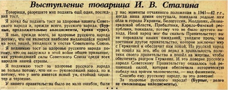 Последним, произнесённым глубоко за полночь, как раз и был тост И. В. Сталина «За русский народ!» Слова генералиссимуса неоднократно прерывались длительными овациями, так что речь заняла по времени чуть не полчаса.