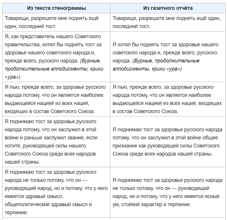 Существуют два основных варианта записи сталинского тоста «За русский народ»: один — по стенограмме, другой — по газетному отчёту. В газетном отчёте среди ошибок советского правительства в первые годы войны появляется Прибалтика, отсутствуют слова о том, что Красная Армия была вынуждена отступать первые два года войны, о неспособности совладать с создавшимся положением, вместо этого внимание акцентировано на победе над фашизмом, а также имеется ряд других отличий.