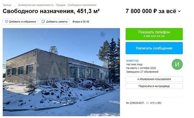 Победителем аукциона в августе стал малоизвестный в Троицке предприниматель по фамилии Лосев. Здание он выкупил за 3,2 млн рублей. Вчера на сайте Avito появилось объявление о продаже объекта уже за 7,8 миллиона.