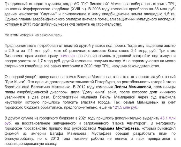 Что объединяет двух последних градоначальников Петербурга, Полтавченко и Беглова, кроме губернаторского кресла? Нет, не низкий рейтинг. Правильный ответ: этническое происхождение. Однако забавным совпадением это кажется ровно до тех пор, пока не начнешь вглядываться в этот вопрос более пристально. В Санкт-Петербурге одной из самых мощных этнических диаспор как раз и является азербайджанская, с ее более полумиллионной (по приблизительным оценкам) численностью. А когда ты становишься первым лицом Санкт-Петербурга, как тут не помочь землякам — особенно в делах предпринимательских?! Не думаю, что на это уходит все губернаторское время, однако урон для города здесь не только в этом. Ряд строительных компаний, «Конрад» и «Петровский строитель», еще в начале нулевых, когда Беглов стал вице-губернатором Петербурга, начали подозрительно легко получать контракты по конкурсным тендерам. Руководителем этих фирм был Вагиф Мамишев, будущий миллиардер и глава «Азербайджанской национально-культурной автономии». Ущерб от их деятельности оценивается почти в 3 млрд рублей.