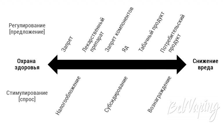 Упрощенный взгляд предполагает, что подходы к регулированию и стимулированию электронных сигарет относятся к спектру вариантов, обрамленных контрастными концептуальными линзами на обоих полюсах. Спектр варьируется от единственного фокуса на защите здоровья на одном конце, до единственного фокуса на использовании электронных сигарет для снижения вреда на другом конце. Линза защиты здоровья основана на принципе, что политика должна предотвращать опасность электронных сигарет. На другом конце спектра, в рамках концепции снижения вреда, утверждается, что политика должна уменьшить более вредные токсикологические последствия курения табачных сигарет. Снижение вреда признает, что пользователи сигарет становятся зависимыми от никотина и не могут легко бросить курить, поэтому желательно снизить вред, связанный с использованием горючих сигарет, поощряя пользователей переходить на менее вредный продукт (например, электронные сигареты).
