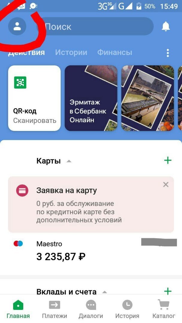1. Заходите в приложение Сбербанк Онлайн и нажимаете на верхний левый кружок.