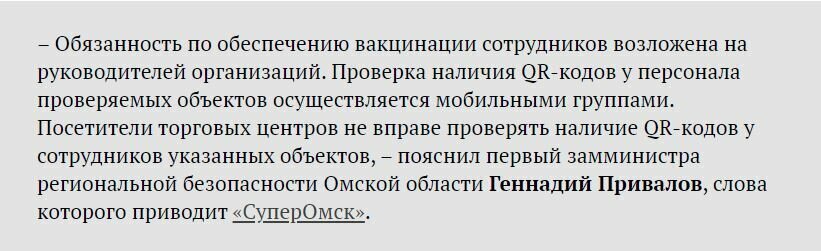 Вопрос того, что Геннадий Привалов объяснил Омску. Вопрос у граждан Омска заключался в чем. Мы приходим в магазин, на входе теперь стоит непонятно кто. Он не в форме сотрудника полиции, не в костюме врача, даже часто и не в форме сотрудника частного охранного предприятия. Этот некто просит нас показать QR-код. Мы показываем, удостоверяя что вакцинированы. И просим его показать свой, чтобы убедиться, что некто тоже вакцинирован. Но оказывается мы на это не имеем права.