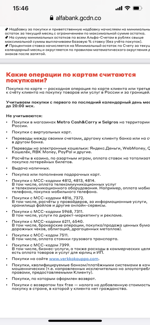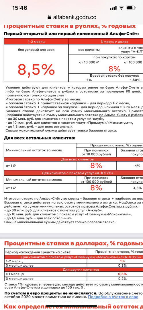 На минуточку, у меня тоже Альфа. Там такие условия (8% на остаток и т.д.) только при большом обороте!!! на самой карте. И не входят в условия этого оборота оплаты ЖКХ, д/садов, даже школьное птание не входит, переводы, оплата билетов и т.д. и т.п. В основном только в продуктовых магазинах оборот на карте, ну и в некоторых пром.товарных, да и то не во всех. Это реклама Альфы? Так озвучьте массу подводных камней, при которых эти условия выполнимы. И, кстати, информирование смс там платное, кроме минимум пакета.