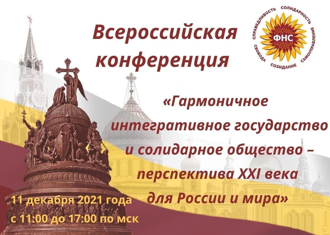 11 декабря 2021 года (с 11-00 до 17-00 часов по мск. времени, регистрация с 10-00) проводят Всероссийскую конференцию «Гармоничное интегративное государство и солидарное общество – перспектива XXI века для России и мира».