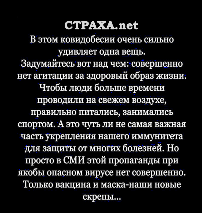 Непрофессионалы и не специалисты начали нами.. руководить.. повсеместно, сея в обществе непонимание и озлоблённость (а кое-где и панику), деля всех на..правильных.. и..неправильных.. Однако действия непрофессионалов грозят нам небывалыми потрясениями... коих и так уже было много. У нас научный подход не приветствуется..., царит лженаучная истерия, основанная на мифической. Иллюзорной опасности в рамках. Прежде всего. Информационного давления на общество.