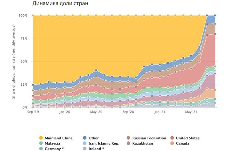 Как менялись доли стран в глобальном майнинге с 2019 по 2021 гг.