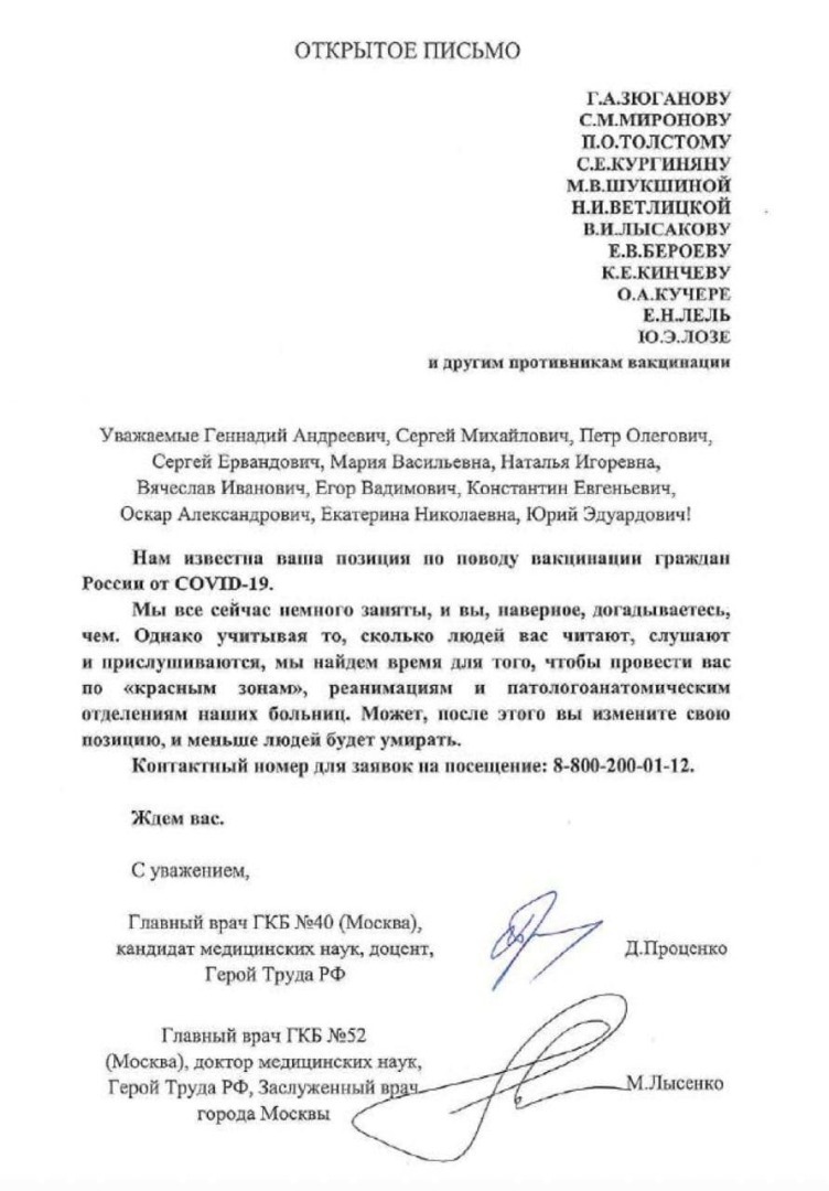«Уважаемый Денис Николаевич! Благодарю вас за Ваше коллективное письмо в адрес так называемых "антиваксеров" , к коим Вы меня причислили. Я опущу этическую составляющую Вашего приглашения меня в красную зону, хотя очевидно, что глазение на тяжелых больных, (не так важно чем), на человека не подготовлненного произведёт ужасающее впечатление. Я перейду к сути.