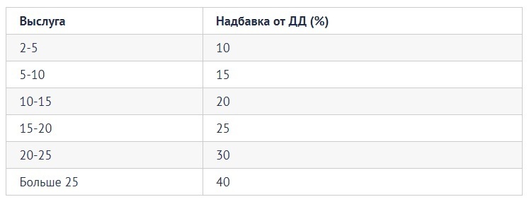 Н – это размер надбавки, сумма зависит от выслуги лет, данные формируются по таблице: