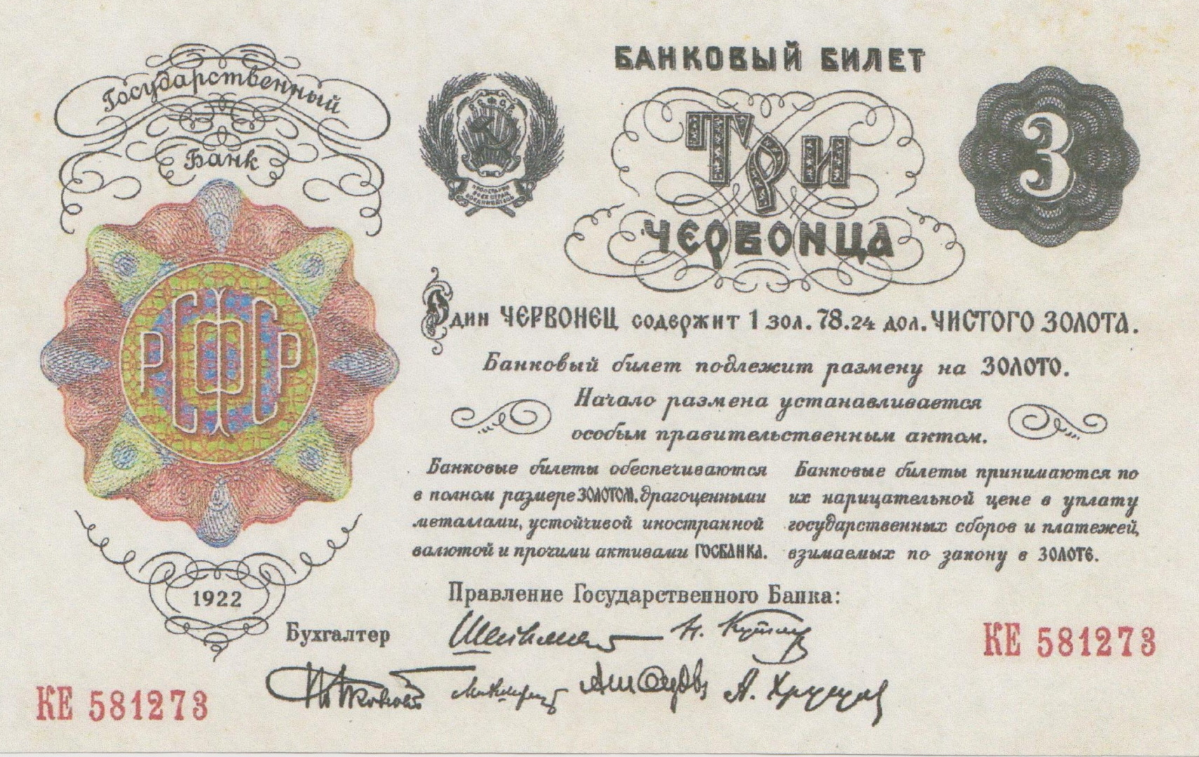С 27 ноября 1922 года началось поступление в обращение банкноты номиналом в 1, 3, 5, 10 и 25 червонцев. На банкнотах было зафиксировано, что 1 червонец содержит 1 золотник 78,24 доли (8,6 грамма) чистого золота, и что «начало размена устанавливается особым правительственным актом».