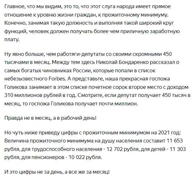 Как минимум забавно, что человек с доходом в миллион в день считает приемлемым, чтобы остальные жили на 10-13 тысяч в месяц. Что ж, давайте посмотрим, что прямо сказал Бондаренко о доходах Голиковой, попавшей в Forbes: Мы видим, как система здравоохранения рухнула, как образование плавно перешло на дистанционное обучение. Мы видим в этом спорт, культуру... Все деградировано, потому что туда не вкладываются деньги.