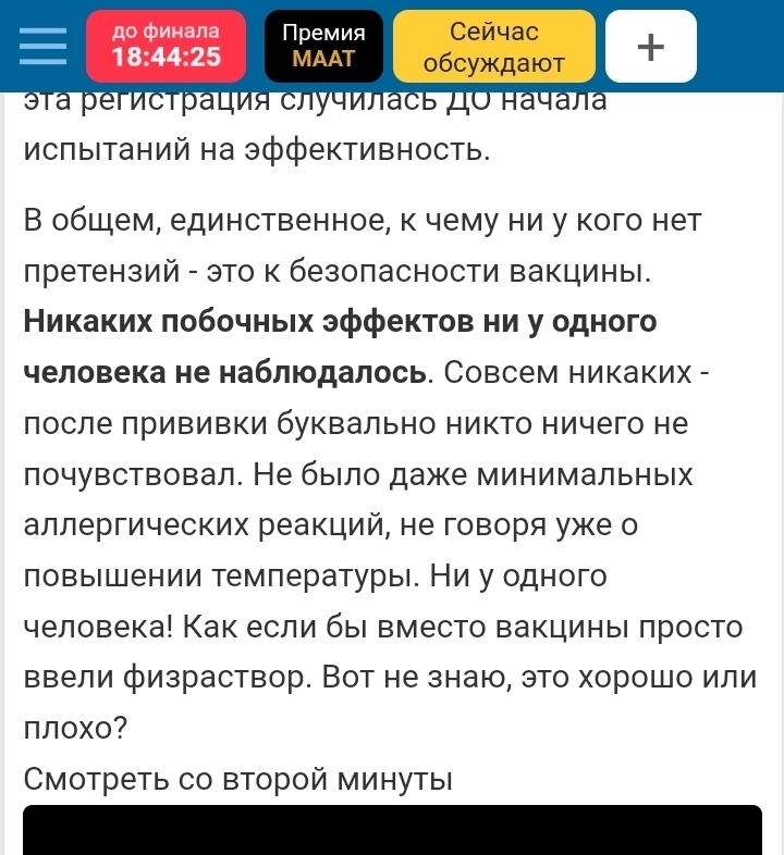 В общем, единственное, к чему ни у кого нет претензий - это к безопасности вакцины. Никаких побочных эффектов ни у одного человека не наблюдалось. Совсем никаких - после прививки буквально никто ничего не почувствовал. Не было даже минимальных аллергических реакций, не говоря уже о повышении температуры. Ни у одного человека! Как если бы вместо вакцины просто ввели физраствор. Вот не знаю, это хорошо или плохо?