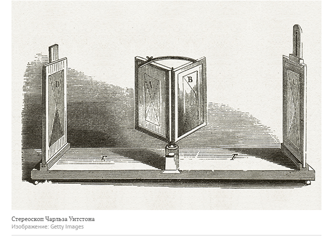 В 1838 году физик Чарльз Уитстон описал принцип обозначения восприятия глубины и трехмерной структуры — стереопсис. На основе своего открытия ученый создал первый стереоскоп — прибор, предназначенный для восприятия объемных изображений. Уитстон использовал пару расположенных под углом 45 градусов по отношению к глазам смотрящего зеркал. Физик доказал, что мозг объединяет изображения объектов, полученных с разных точек, в результате чего предмет кажется объемным.