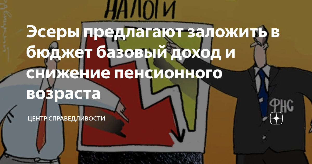 Источник: https://zen.yandex.ru/media/spravedlivo/esery-predlagaiut-zalojit-v-biudjet-bazovyi-dohod-i-snijenie-pensionnogo-vozrasta-617c5f05d709ae50eee133d4