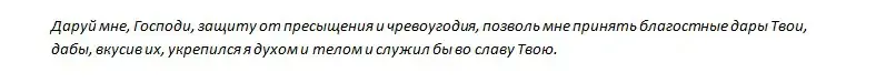 Молитвы ежедневно читается перед приемом пищи "Отче наш", после которой можно добавить слова (если вам тяжело сдержать себя в пищевых ограничениях):