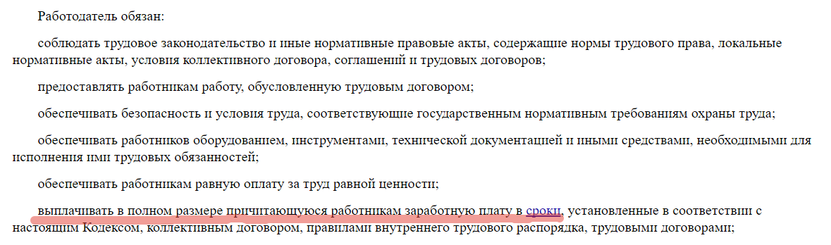 Начнем с того, что согласно статье 22 ТК РФ в перечень обязанностей работодателя входит выплата заработной платы в полном размере причитающейся работникам в сроки, установленные в соответствии с ТК РФ, коллективным договором, правилами внутреннего трудового распорядка и трудовыми договорами.