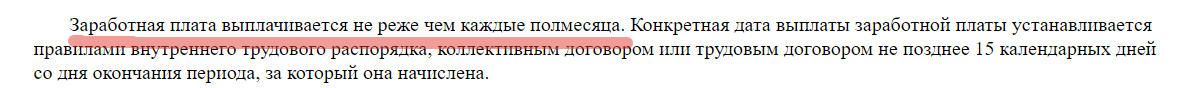 В соответствии со статьей 136 ТК РФ заработная плата должна выплачиваться работнику не реже чем каждые полмесяца. Помимо этого конкретная дата выплаты заработной платы устанавливается правилами внутреннего трудового распорядка, коллективным договором или трудовым договором не позднее 15 календарных дней со дня окончания периода, за который она начислена.