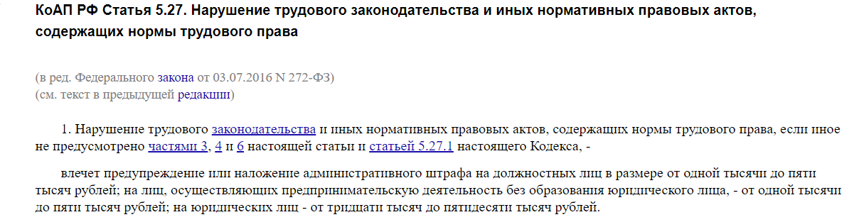 Согласно ч.1 ст. 5.27 КоАП РФ нарушение трудового законодательства и иных нормативных правовых актов, содержащих нормы трудового права влечет за собой предупреждение или наложение административного штрафа на должностных лиц в размере от одной тысячи до пяти тысяч рублей; на лиц, осуществляющих предпринимательскую деятельность без образования юридического лица, - от одной тысячи до пяти тысяч рублей; на юридических лиц - от тридцати тысяч до пятидесяти тысяч рублей.