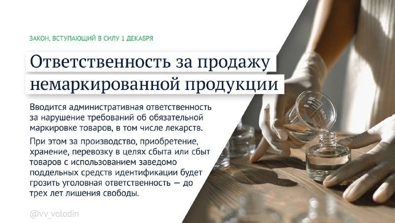 Вступит в силу административная ответственность за нарушение требований об обязательной маркировке продукции. Мера, уточняет Володин, касается и лекарственных препаратов. При этом "за производство, приобретение, хранение, перевозку в целях сбыта или сбыт товаров с использованием заведомо поддельных средств идентификации" предусмотрена уголовная ответственность — до трех лет лишения свободы.