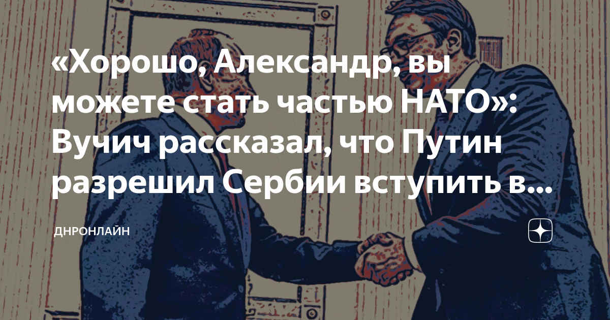 Источник: https://zen.yandex.ru/media/dnronline_ru/horosho-aleksandr-vy-mojete-stat-chastiu-nato-vuchich-rasskazal-chto-putin-razreshil-serbii-vstupit-v-nato-619cdd4e0482894aff6d9777