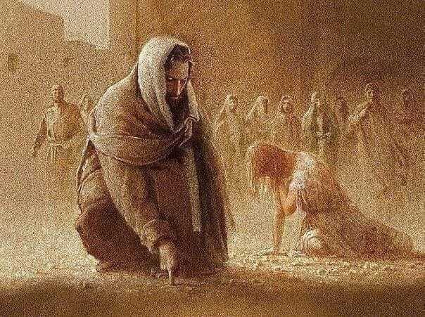 "Помните женщину, которую хотели убить за измену мужу, Иисус защищает от толпы одной лишь фразой: кто из вас без греха, первый брось на нее камень? (Ин 8:7). И при этом даже не поднимает головы, изображая на песке какие-то знаки.