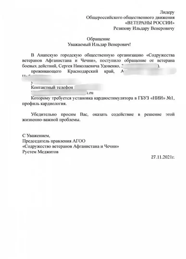 В обращении содержится просьба от ветерана боевых действий, подполковника запаса Сергея Николаевича Удовенко, которому требуется установка кардиостимулятора в ГБУЗ «НИИ» №1 Краснодарского края.