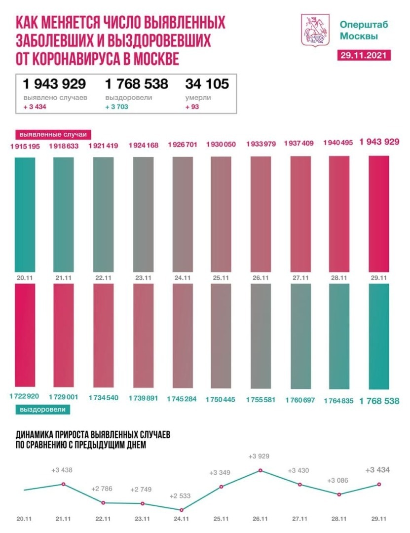 Столичный оперштаб сообщает, что в Москве за сутки выявлено 3434 новых случая COVID-19. Госпитализированы 747 человек, скончались 93 пациента. На ИВЛ в московских больницах находится 601 человек.
