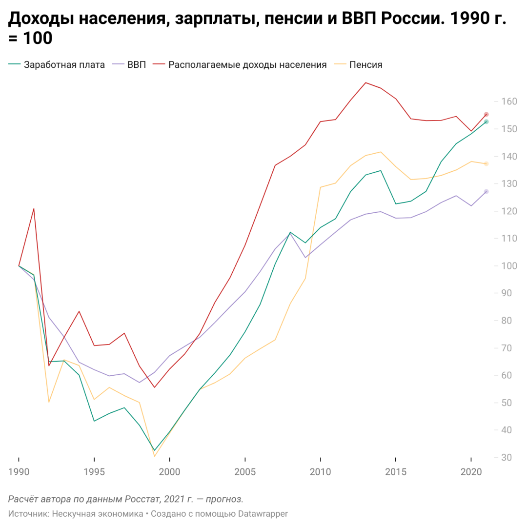 К 2021 году от уровня 1990 года в реальном выражении располагаемые доходы населения выросли на 55%, заработная плата — на 53%, а пенсии — на 37%.