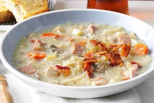 Грибы почистить, порезать. В сковороде разогреть сливочное масло, добавить грибы, обжарить до полуготовности, уменьшить огонь. Всыпать муку, постоянно помешивая. Медленно влить подогретые сливки (или молоко), продолжая помешивать. Довести до кипения, отставить. Картофель и морковь почистить, порезать. Стебли сельдерея, колбасу, отварное куриное филе порезать на кубики. Нарезанные ингредиенты сложить в кастрюлю, добавить грибы и капусту, всыпать укроп и перец, залить бульоном, все перемешать. Довести до кипения, закрыть крышкой и готовить на медленном огне до готовности в течение 1 часа. Когда суп будет почти готов, при необходимости добавить соль по вкусу. Для подачи - нарезать свиную грудинку на тонкие ломтики, посолить, поперчить и обжарить до золотистого состояния, затем порезать на маленькие кусочки и всыпать в тарелки с супом.