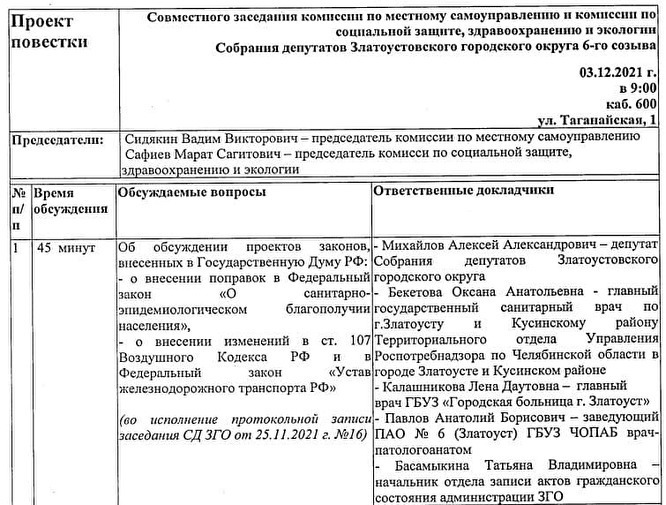 В собрании депутатов Златоуста (Челябинская область) планируют обсудить поправки в федеральное законодательство, которое предусматривает введение QR-кодов в авиа и жд-транспорте. Как сообщил Znak.com депутат городского собрания Алексей Михайлов, вопрос вынесен на совместное заседание комиссий по местному самоуправлению и экологии. Депутаты планируют заслушать главного врача городской больницы, руководителя патанатомии, а также главного санитарного врача города.