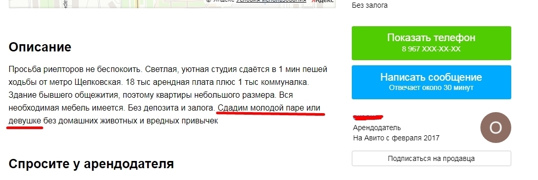 Переходим к самому интересному, доказательствам того, что многие арендодатели Москвы прямо ущемляют права одиноких, простите, свободных, мужчин.