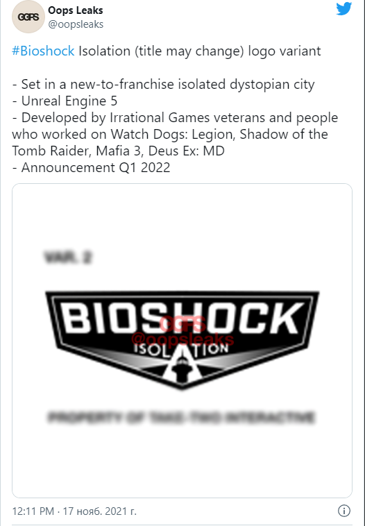 Как сообщается, будущая игра будет называться BioShock Isolation. Её разрабатывают на движке Unreal Engine 5, при этом анонс ожидается в первом квартале 2022 года. Также утверждается, что над проектом работают бывшие разработчики Watch Dogs: Legion, Shadow of the Tomb Raider, Mafia 3 и Deus Ex: Mankind Divided.
