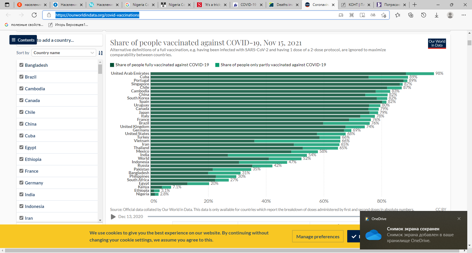 Нигерия: привито 2.8% населения, население 206 463 745 человек, 2968 случаев смерти, 213 777 случаев инфекции Covid-19 с начала пандемии. Процент заболевших Covid19 от общего числа населения: 0.1% Интервью с главным эпидемиологом Нигерии, Чикве Ихеквеазу, директором Центра по контролю заболеваний Нигерии, заместителем генерального директора ВОЗ по по разведке чрезвычайных ситуаций в области здравоохранения, о эпидемиологической обстановке в Нигерии: "Q: Вы можете объяснить факт, что в вашей стране все не так плохо как в других регионах мира? Не потому ли это, что большую часть населения составляют молодые люди? Менее благоприятные условия для распространения? Do you have an explanation for the fact that it is not as bad as in some other regions of the world? Is it because a larger proportion of the population is young? Less favorable conditions for transmission? A: Существует множество вещей, на которые можно указать, но любой, кто скажет, что знает причину, будет нечестен по отношению к самому себе. И мы еще в пути. Это может измениться. There are many things you can point at, but anyone who says he knows the reasons is not honest to himself. And we are still in the middle of it. It could still change." https://cont.ws/@id526556416/2136038