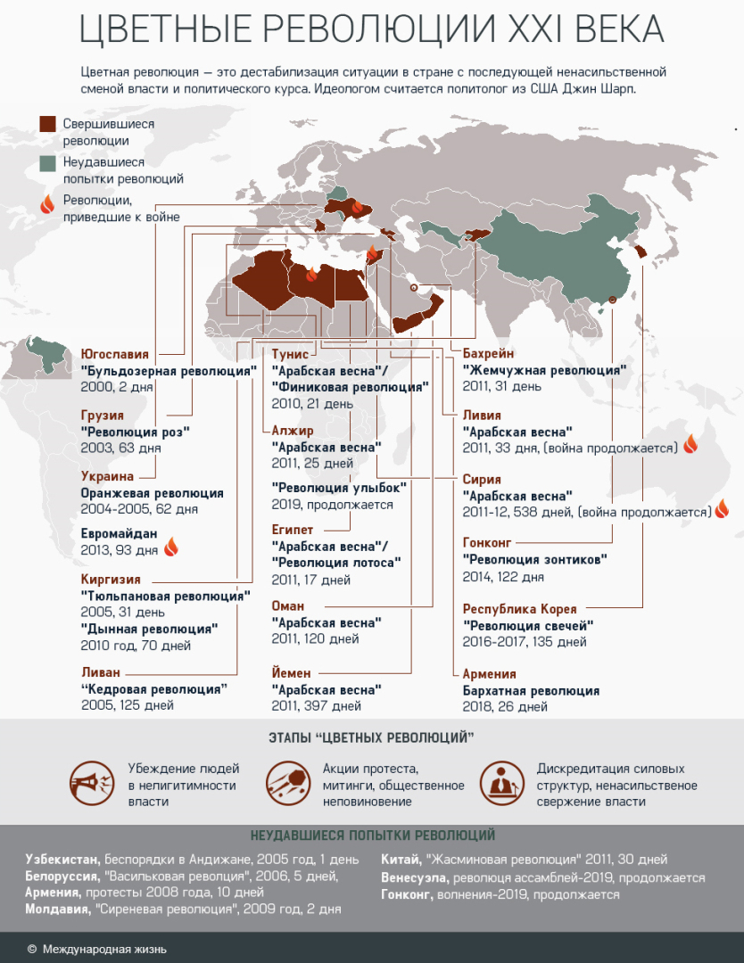 В последние 30 лет население нашей страны познакомилось с термином - «цветная революция». Под «цветными революциями» понимают проекты по свержению легитимной власти в странах второго мира (бывший СССР и его союзники) и третьего мира (Ближний Восток, Африка, Азия, Латинская Америка). Такие события стали обыденным явлением в мировом процессе развития. Только с 2000 года их произошло более 20. Принято считать, что такие события планируются и запускаются США при содействие стран НАТО и политических элит внутри стран, которые стремятся к власти.