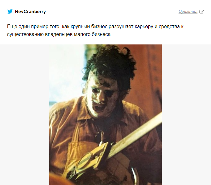 Однако часть пользователей соцсети поиронизировали над, возможно, фейковым магазином, вспомнив популярные киноленты про маньяков и серийных убийц. Например, блогер с ником RevCranberry (@Revkun_) в шутку сравнил изделия PETA с маской из кожи, которую носил герой фильма ужасов «Техасская резня бензопилой».