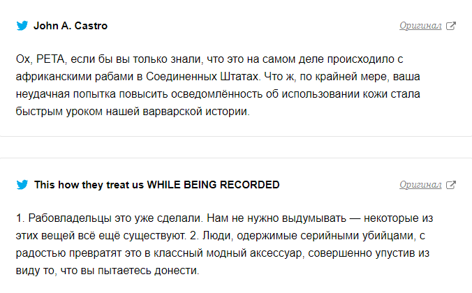 Помимо, как показалось некоторым блогерам, нелепости акции критики припомнили организации другой факт — изделия из человеческой кожи якобы действительно существовали в США во времена работорговцев, а жертвами для таких вещей становились темнокожие рабы.
