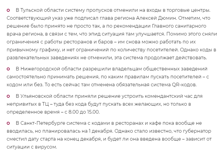 Также СМИ сообщили об отмене QR-кодов в Ивановской области. Здесь их перестали требовать в ТЦ. Власти регионов позволили администрациям самостоятельно решать, нужен ли посетителям цифровой документ или нет.