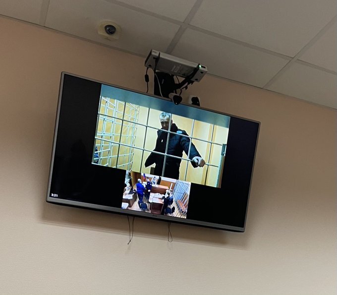 Алексей Навальный участвовал в заседании суда по видеосвязи из колонии. Полякова опубликовала фотографию с Навальным. На снимке политик показан на экране трансляции, он стоит в тюремной робе в помещении с решетками.