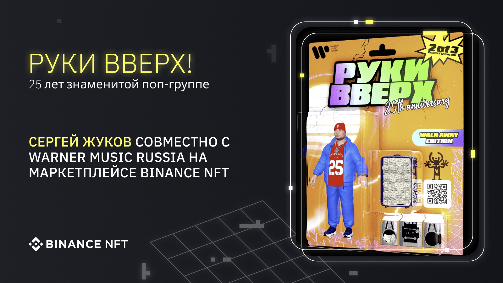 Мы рады поделиться новостью, что сегодня фронтмен группы “Руки Вверх” Сергей Жуков совместно с музыкальным лейблом Warner Music Russia в рамках 25-летнего юбилея музыкального коллектива, представляют серию уникальных NFT на маркетплейсе Binance NFT.