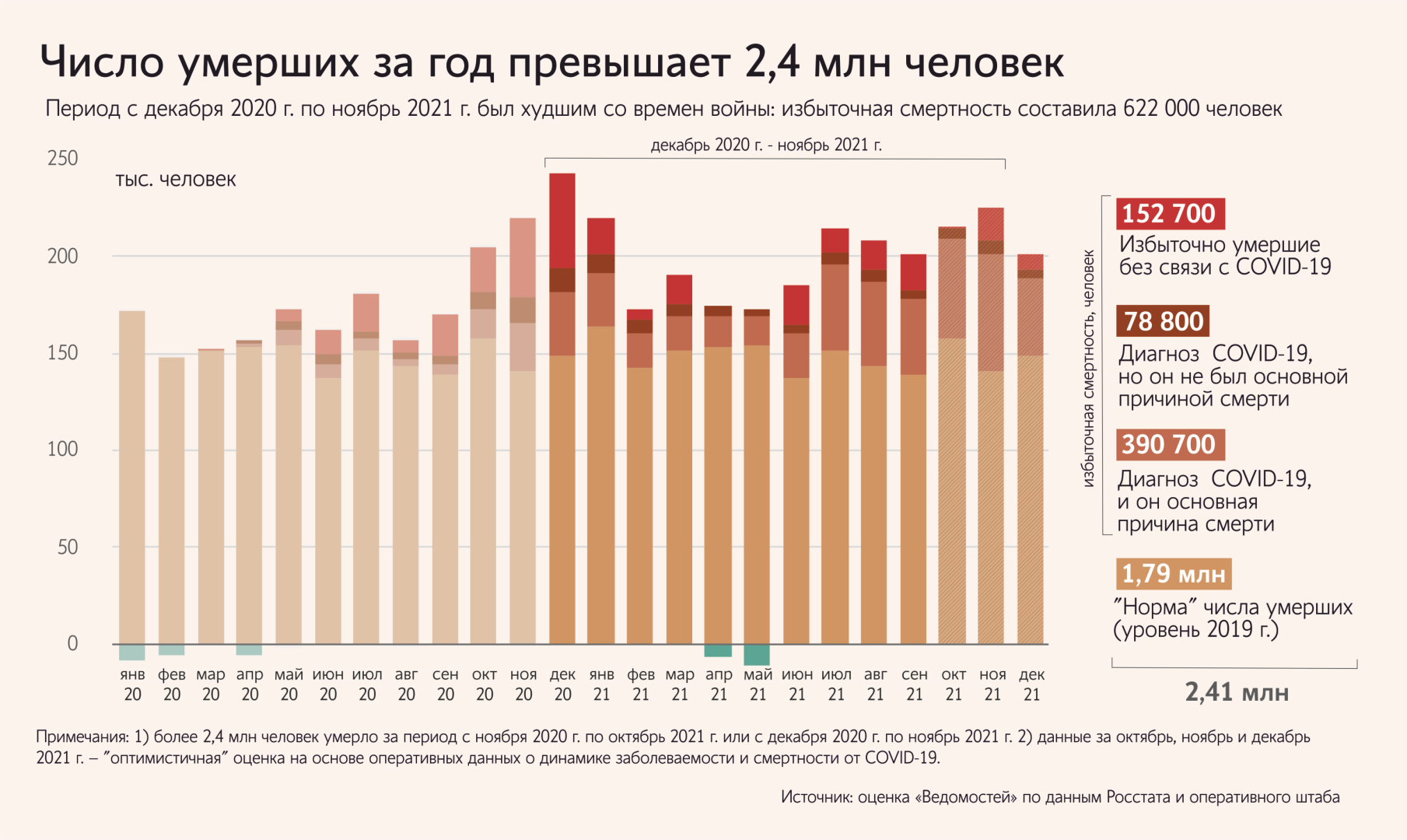 В период с декабря 2020-го по ноябрь 2021 года смертность превысила 2,4 млн человек, а убыль населения приблизилась к 1 млн россиян. Число умерших в России за последние 12 месяцев, т. е. с декабря 2020 г. по ноябрь 2021 г., превысило 2,4 млн человек. Это худший период после 1945 г. Естественная убыль населения без учета миграции перешагнула отметку в 990 000 человек за последний год, следует из оптимистичной оценки «Ведомостей», ее подтверждают демографы Алексей Ракша и Борис Синельников. Прежний антирекорд по числу умерших был в 2003 г., когда ушло из жизни 2,37 млн человек, а худшие показатели по убыли — в 2000 г., когда страна потеряла 958 532 человека. Более плачевная ситуация была только во времена Великой Отечественной войны 1941–1945 гг. В 1941–1945 гг. смертность была на уровне 30-50 на 1000 человек, то есть в 2-3 раза больше, чем сейчас (16,5 промилле). План по смертности превысили В начале октября правительство оценивало, что смертность населения в 2021 г. составит 15,6 на 1000 человек, а убыль — 6,4 промилле, следует из данных Единого плана по достижению национальных целей развития РФ на период до 2024 г. и на плановый период до 2030 г. Но уже к сентябрю годовые данные были значительно хуже. За октябрь 2020 г. — сентябрь 2021 г. число умерших достигло 2,39 млн человек, или около 16,4 на 1000 человек. С тех пор ситуация только ухудшилась. В сентябре от коронавируса умирал в среднем 801 человек в день, а в ноябре — 1222 россиянина, следует из данных оперативного штаба. В итоге период с декабря 2020 г. по ноябрь 2021 г., который вбирает в себя три волны пандемии, оказывается одним из худших за последние 75 лет. Число умерших за этот период составило более 2,41 млн россиян, или 16,5 на 1000 человек, следует из оптимистичной оценки «Ведомостей». По итогам года демографические показатели будут значительно хуже, чем в 2020 г., утверждает главный научный сотрудник Института демографических исследований ФНИСЦ РАН Алла Иванова. По оценке демографа Алексея Ракши, к концу ноября число умерших уже перевалило за 2,55 млн человек. За весь 2021 г. смертность будет не меньше 2,45 млн, а убыль — 1,05 млн человек. Если взять уровень смертности 2019 г. за условную норму, то выше этой нормы с октября 2020 г. по сентябрь 2021 г. умерло около 607 000 человек, а с прошлого декабря по ноябрь — не менее 622 000 человек. Главная причина избыточной смертности COVID-19 сделал основной вклад в сверхсмертность, считает профессор кафедры социологии семьи и демографии социологического факультета МГУ Борис Синельников, с ним согласен Ракша. Поэтому рост в октябре и ноябре числа умерших от коронавирусной инфекции позволяет предположить, что и с общей смертностью ситуация стала хуже. За период с октября 2020 г. по сентябрь 2021 г. с диагнозом COVID-19 скончалось 406 000 человек, или две трети, публикует Росстат данные Минздрава. В частности, 275 000 — это умершие непосредственно от коронавирусной инфекции (по информации оперативного штаба на основе данных Роспотребнадзора, их 187 000 человек из-за иной методики учета). Еще у 43 000 человек COVID-19 был лишь предположительно. Последняя группа — 87 000 умерших — это те, у кого диагностировали коронавирусную инфекцию, но она не была основной причиной смерти или не оказывала существенного влияния на смертельные осложнения. Но это только часть избыточной смертности. Около 201 000 человек пришлось на сверхсмертность, не связанную с новым коронавирусом. Мнения 