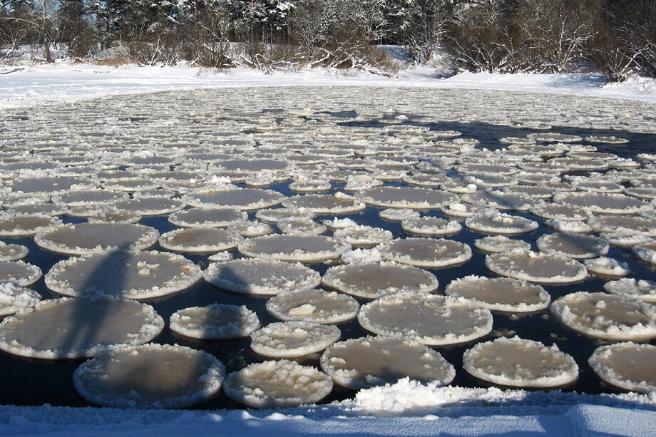 Метеорологи говорят, что такой лёд возникает из-за резкого холода, активного течения воды и ветра. Вода замерзает, льдины тут же раскалываются, шлифуются волнами. Так образуются ледяные округлые «блины».