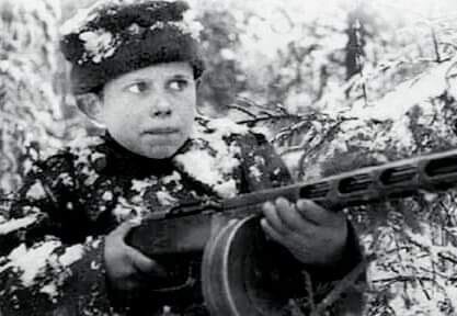 Леня Голиков, 16 лет, герой-партизан. Бригадный разведчик 67 отряда четвертой ленинградской партизанской бригады, действовавшей на территории Новгородской и Псковской областей. Участвовал в 27 боевых операциях.