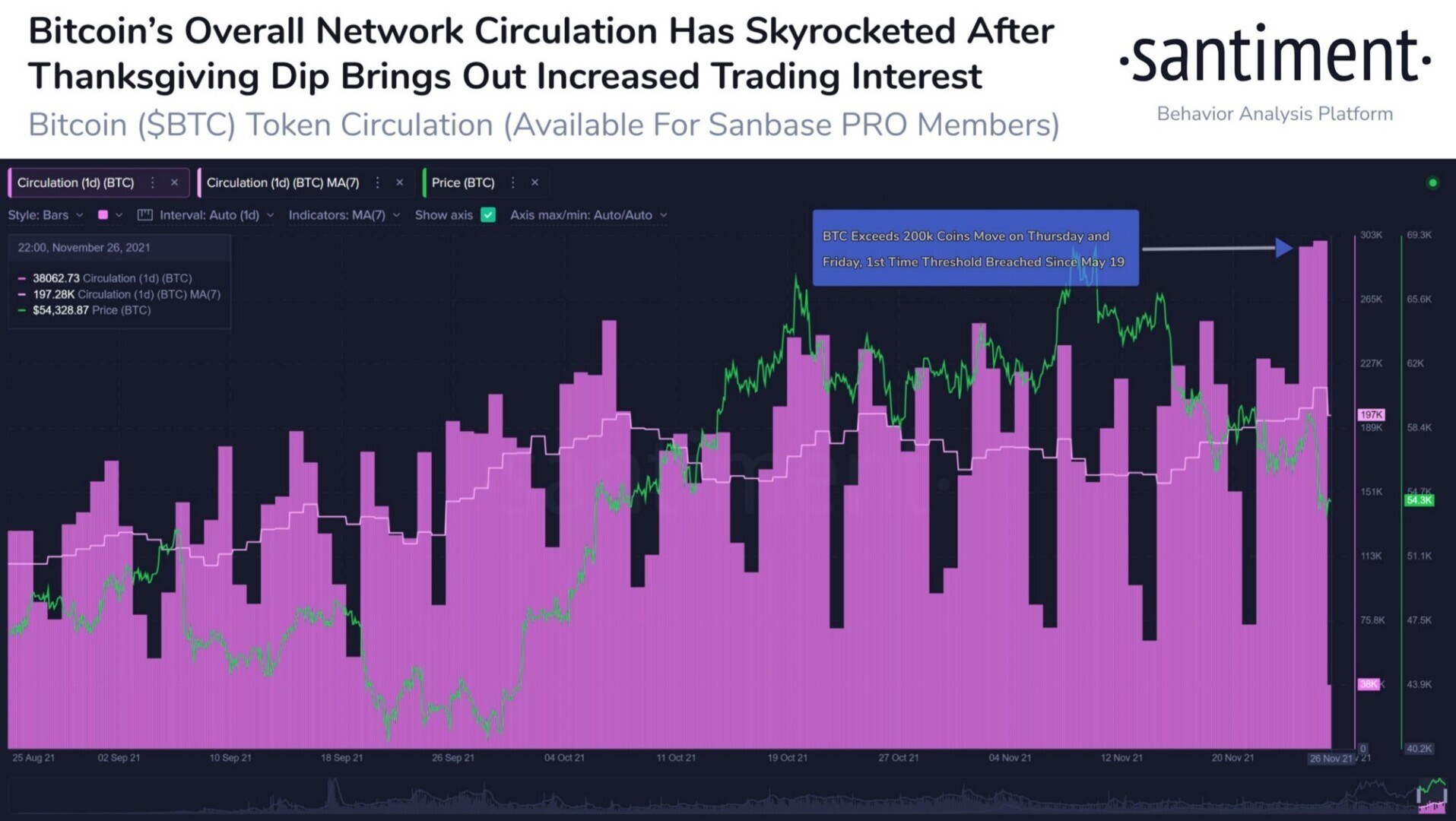Кроме того, обвал биткоина 26-11-2021 был вызван, прежде всего, новым вариантом COVID-19 и почти всеми мировыми рынками. Однако приведенный ниже график от Santiment показывает и другую картину. Впервые более чем за шесть месяцев в День благодарения, или за день до "черной пятницы", в обращении появилось более 200K BTC. Огромная распродажа майнеров привела нас сюда? Возможно.
