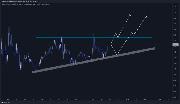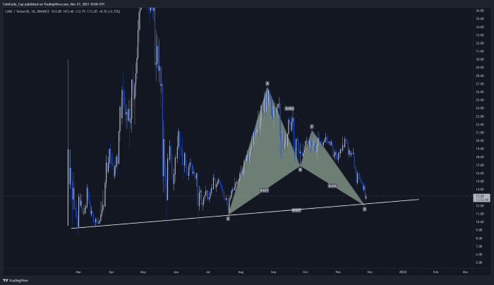 Как мы видим на графике ниже, CAKE формирует бычий гармонический паттерн. Кроме того, поскольку цена значительно упала во время обвала COVID ч. 2 (да, я называю это так), она находится в хорошей зоне накопления. Кроме того, она также находится у важной трендовой линии поддержки, и цена также отступила. Таким образом, можно предположить, что CAKE может стать отличной возможностью для получения прибыли в декабре.