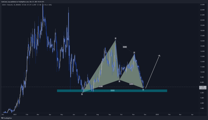 Подождите, мы только что видели похожую картину выше в статье. Это был CAKE? Да! SUSHI также находится в потенциальной зоне разворота гармонического паттерна. Кроме того, он торгуется в зоне спроса. Поэтому мы можем ожидать отличного бычьего ралли в декабре.