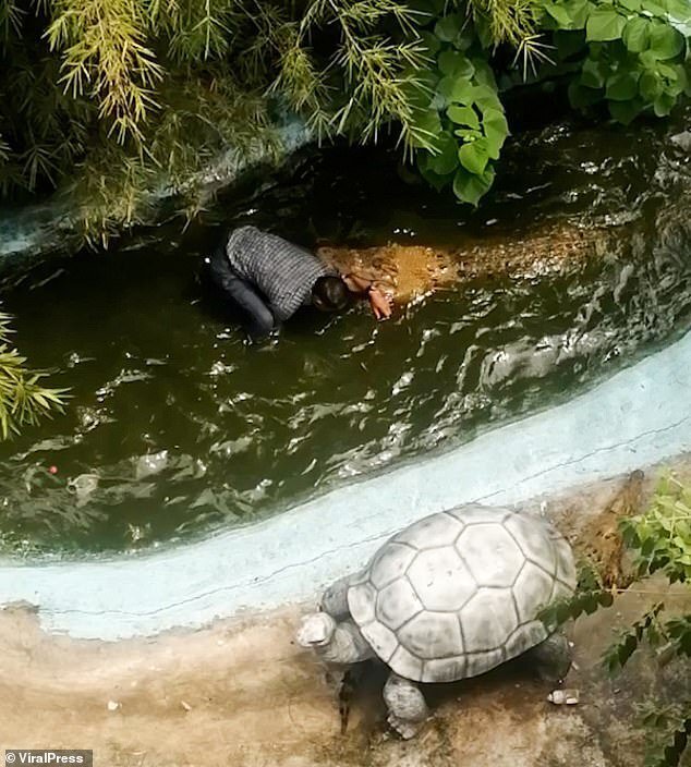 небольшой водоём, а в нём пластикового крокодила. Вокруг бассейна очень красивый пейзаж, скульптура черепахи. И именинник решил сделать селфи с рептилией на память о знаменательном дне. Спустился с телефоном вниз, залез в бассейн, постучал по голове крокодилу и уже приготовился к фотосессии, как "пластиковый" крокодил вдруг ожил и схватил его за руку.